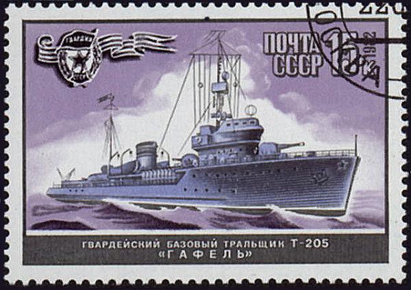 | Trałowiec bazowy GAFIEL (T-205) na znaczku wydanym w ZSRR w 1982 r. Uczestnik II wojny światowej (Flota Bałtycka) Ze zbiorów autora. |