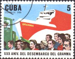 | Znaczek poczty kubańskiej wydany w 1986 roku z okazji 30. rocznicy misji jachtu GRANMA. Kliknij obrazek, aby powiększyć Zbiory autora. |