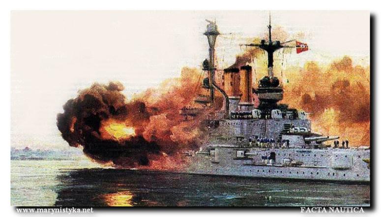 Pancernik SCHLESWIG-HOLSTEIN - salwa rufowej artylerii kalibru 280 mm.