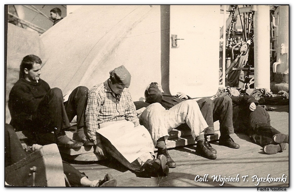 Gdynia, 12.02.64*) Witajcie. --------Przez ostatnie cztery dni – środa do niedzieli włącznie – znów byliśmy na HORYZONCIE. W programie był krótki dwudobowy rejsik i na zakończenie egzaminy z nawigacji i instrumentów nawigacyjnych. Do oceny włączało się również stopień ze sprawozdań.*) --------Trafiliśmy tak nieszczęśliwie, że przez cały pobyt na morzu wiała „dziewiątka” (20 m/sek.) i porządnie kołysało. Chłopaki rzygali jak jeden mąż. Wyobraźcie sobie, że na okres czterech godzin uległem i ja! Nic nie przeczuwając, tuż przed wypłynięciem, najadłem się do syta mdłych kartofli z potwornie mdłym sosem. Wszystko byłoby dobrze, gdyby nie czterogodzinna służba asystencka. Sterczałem na mostku i czułem, jak koktajl kartoflano-sosowy zaczyna wyprawiać niespokojne podrygi. Hołd złożyłem cztery razy, w odstępach mniej więcej godzinnych. Swoją drogą, ten Neptun jest bardzo niewybredny w przyjmowaniu darów. Dopiero wtedy przekonałem się, jak można dostać porządnie w tyłek. Rzeczywiście, te cztery godziny były małym koszmarkiem – i mam nadzieję cholerną pomyłką. Walczyłem ze smrodem nawigacyjnej kabiny i z mdłościami, nie mogąc ani trochę przysiąść, ponieważ wisiał nade mną wzrok oficera wachtowego. Chwilami czułem się rzeczywiście porządnie zmęczony. --------Pocieszano mnie później, że ta cholerna krypa uczyniła „wyrwę w honorze” już niejednemu wilkowi morskiemu. Podobno chorowali po raz pierwszy tacy, którzy mieli już wiele rejsów za sobą i przeszli bez szwanku cały szereg dąsów Neptuna. Tłumaczy się to tym, że HORYZONT ma bardzo małe wymiary i małą stateczność, przez co częstotliwość kołysania jest stosunkowo duża. --------Ja właściwie nic na tym, nie straciłem (poza porcją i tak niesmacznego obiadu), zyskując tylko notatkę w notesie z ocenami: „wykazuje zainteresowanie, wytrwały mimo choroby morskiej”. To dużo znaczy i rzeczywiście mnie ucieszyło. Miałem małą próbę swoich sił i raczej wyszedłem z niej zwycięsko. Praktykę zaliczyłem ogólnie na 4*). --------Jutro, tzn. w czwartek cała nasza klasa idzie pracować na DAR POMORZA. Praca będzie trwała pięć roboczych dni, z wyjątkiem wtorku, kiedy jest Studium Wojskowe. Zajęć w szkole nie będzie. Mamy codziennie od 7 do 14.30 przerzucać z zęz do międzypokładu balast. DAR stoi na stoczni i przewidziana jest m.in. konserwacja zęz, dlatego trzeba wyciągnąć z nich balast – jest tego aż 600 ton. Popołudnia będziemy mieli wolne, obfite jedzenie na statku też*). --------Na razie cześć.