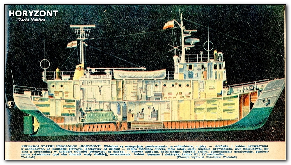 *) Musieliśmy jakoś odreagować czas spędzony w Szkole. Młodość miała swoje prawa, więc znudzeni męskim towarzystwem na co dzień, szukaliśmy towarzystwa dziewcząt. Celem naszych wypadów była przyjemna kawiarenka na Skwerze Kościuszki (niestety nie pamiętam jej nazwy – chyba Kopciuszek, albo Czerwony Kapturek, lub całkiem coś innego. Może Robert będzie pamiętał?). Było to doskonałe miejsce do zawierania damsko męskich znajomości. *) Te małpie dowcipy i kawały były wyrazem naszej nieskończonej i bogatej inwencji twórczej. Do ich arsenału należało min. napełnianie wodą prezerwatyw do granic wytrzymałości i wsuwanie ich pod kołdrę śpiącego kolegi. Nieostrożny ruch nogą powodował ich pęknięcie i potop w łóżku. Pamiętam też wymagające precyzji wysunięcie łóżka w nocy ze śpiącym kolegą i przetransportowanie go do ubikacji. Pracowało przy tym czterech dowcipnisiów (w tym ja), po jednym przy każdej nodze łóżka. Efekt budzącego się rano w tym miejscu delikwenta był niezapomniany! *) HORYZONT był to statek instrumentalny, na którym odbywaliśmy naukę praktycznej obsługi znajdujących się tam urządzeń i instrumentów nawigacyjnych. Między innymi uczyliśmy się obsługi radaru morskiego i na tej podstawie otrzymywaliśmy potem Dyplom Obserwatora Radarowego. Zbudowany w 1953 r jako lugrotrawler typu B-11 PUCHACZ w Stoczni Północnej w Gdańsku, o tonażu 200,36 BRT, został przebudowany na statek instrumentalny w Stoczni Marynarki Wojennej w Gdyni. Podniesienie bandery na HORYZONCIE odbyło się - 29.09.1963 r. a więc w tym samym roku, kiedy rozpoczęliśmy naukę w Szkole. Jego niewielkie rozmiary – dł. 32,6 m, szer. 6,7m i wysoko położony środek ciężkości powodowały, że był bardzo podatny na nieprzyjemne kołysanie, nawet przy niewielkiej fali. Mało kto je wytrzymywał bez ulegania chorobie morskiej (wspomnę o tym jeszcze). W 1964 roku dołączył do niego bliźniaczy ZENIT, o tym samym pochodzeniu i przeznaczeniu.