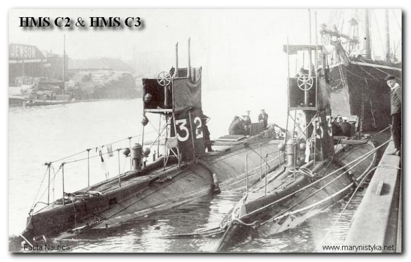 Brytyjski okręt podwodny HMS C2 i HMS C3 w Yarmouth w roku 1908. The British C-class submarines HMS C2 and HMS C3 at Yarmouth in 1908. Built by Vickers, Sons & Maxim Ltd, Barrow. Launched 1906.