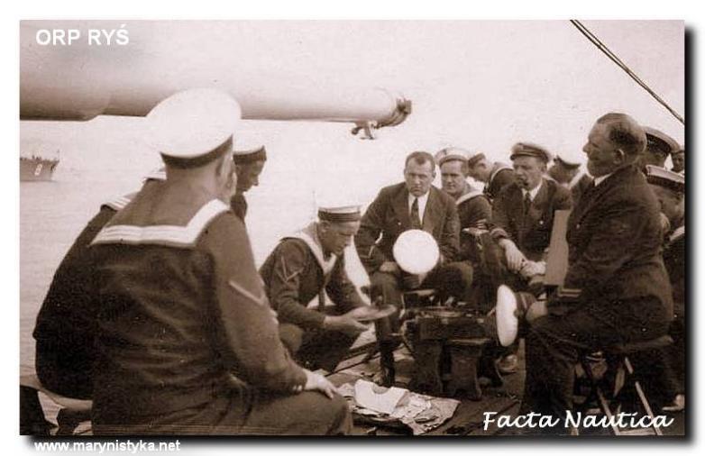 Analizując prezentowaną serię fotografii ORP RYŚ można dojść do wniosku, że 100 milimetrowe działo pokładowe ogniskowało wokół siebie życie na okręcie. Powyżej widzimy kilkunastu członków załogi słuchających muzyki płynącej z gramofonu.Skrajnie po lewej stronie dostrzec można dziób niszczyciela ORP BURZA.