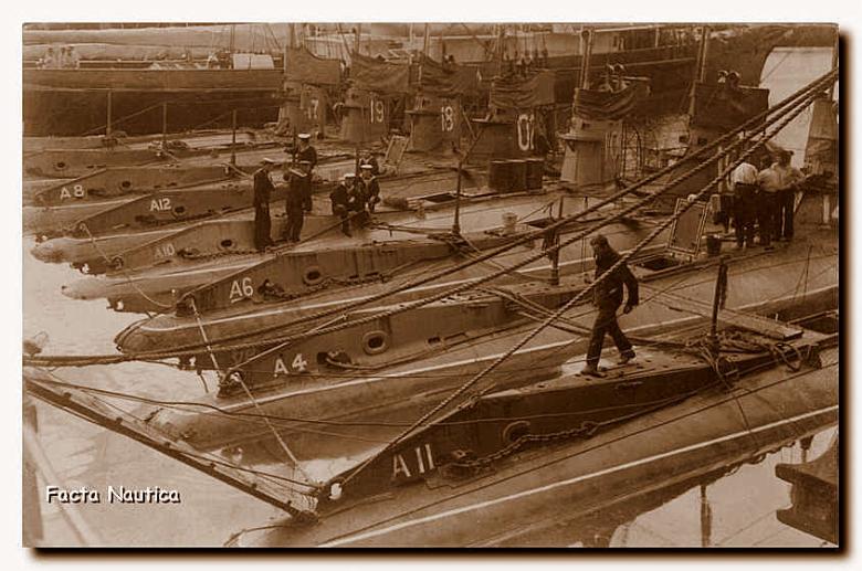 | Brytyjskie okręty podwodne typu "A" na starej pocztówce. Zbiory autora. A group of British "A" class submarines. The "A" class was the Royal Navy's first class of British-designed submarines.They were an improvement on the US PLUNGER class. Thirteen submarines of this class were built by Vickers at Barrow-in-Furness between 1902 and 1905. Old postcard. Author's collection. |